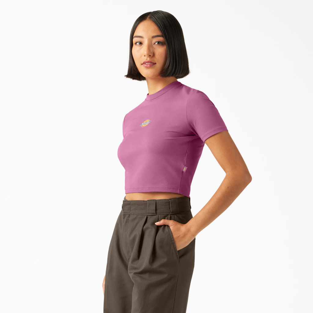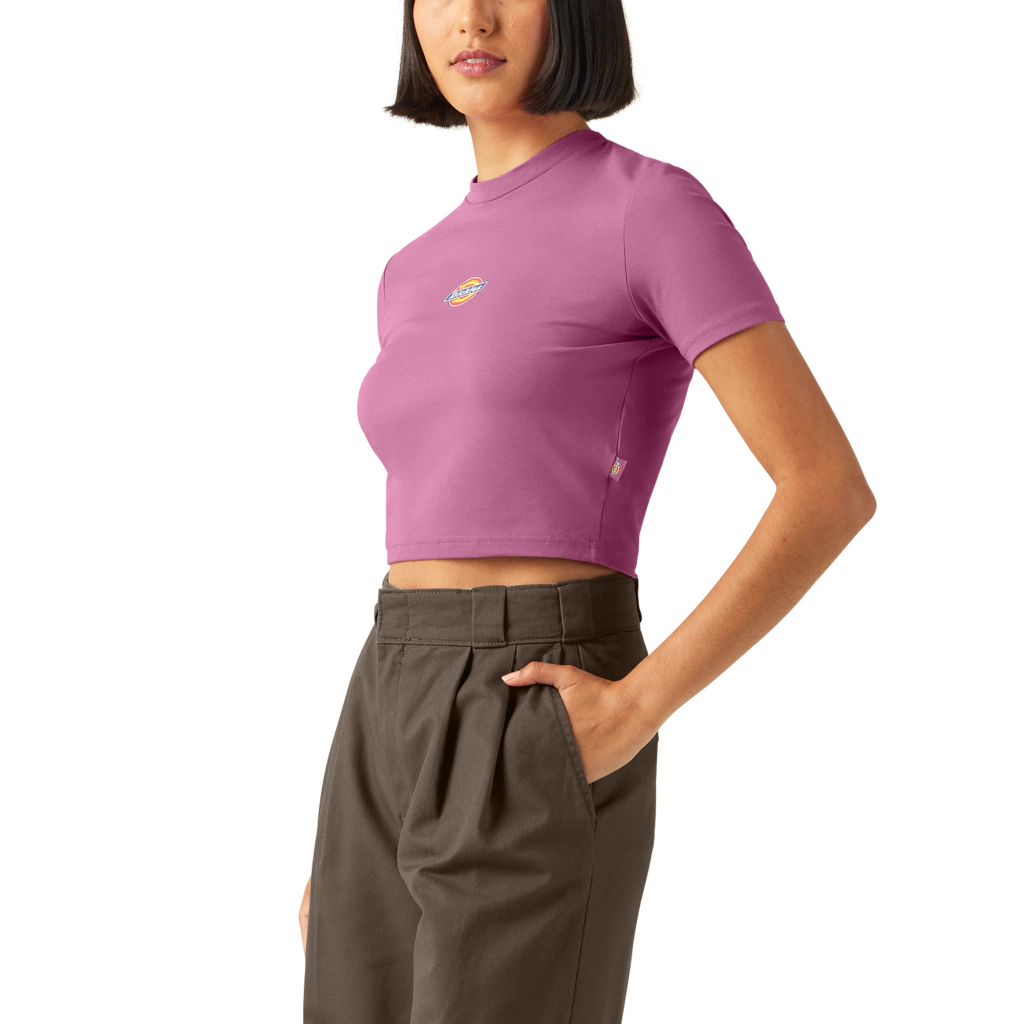La camiseta Maple Valley es una camiseta de manga corta, ajustada y con corte cropped para mujer. Presenta un cuello redondo con un estilo nostálgico de los 90 y el logotipo de Dickies en la parte delantera. Una camiseta femenina de verano ideal para el día a día.